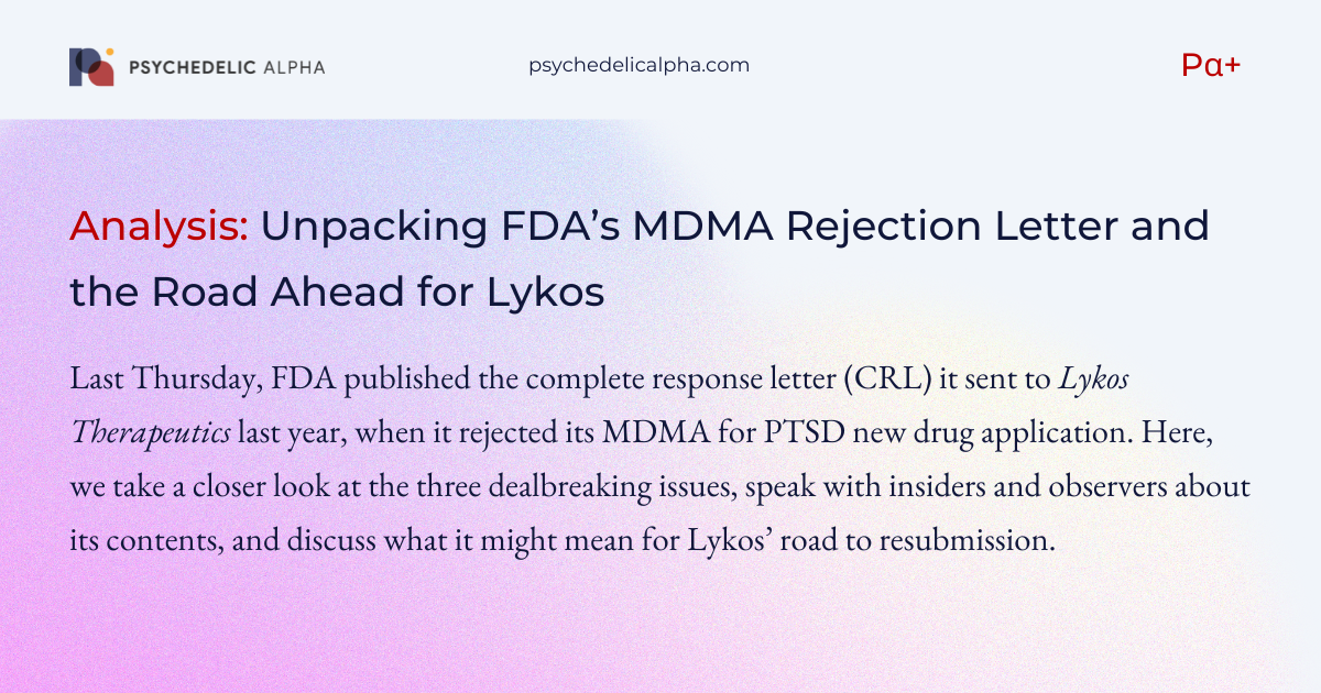 Among them was the letter it sent to Lykos Therapeutics last August, when it rejected its MDMA for PTSD new drug application. We broke the news on Thursday morning and will share a little more detail with our Pα+ subscribers on Monday.