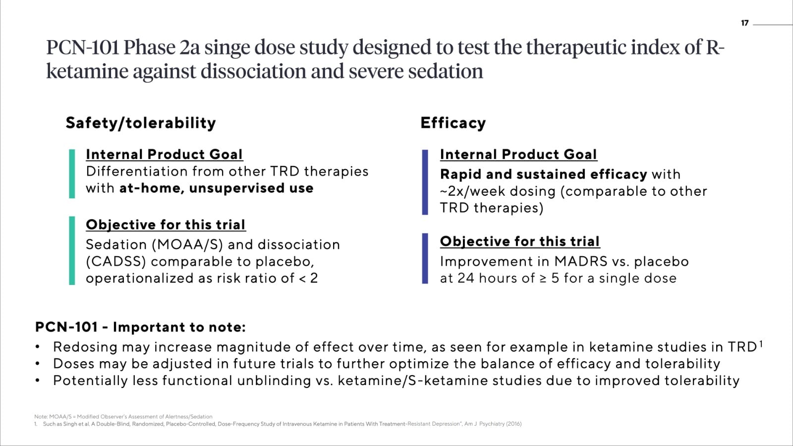 In order to evaluate the safety and tolerability of PCN-101 in this trial, the company chose to measure sedation using the Modified Observer’s Alertness/Sedation Scale (MOAA/S) and dissociation using the Clinician-Administered Dissociative States Scale (CADSS).