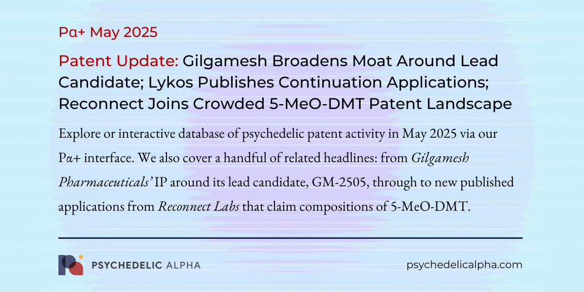 May 2025 Psychedelic Patent Update: Gilgamesh Broadens Moat Around Lead Candidate Following Positive Phase 2a Readout; Lykos Publishes Further Continuation Applications; Reconnect Joins Crowded 5-MeO-DMT Patent Landscape Post published:June 12, 2025 Post category:Psychedelic Patent Analysis/Pα+