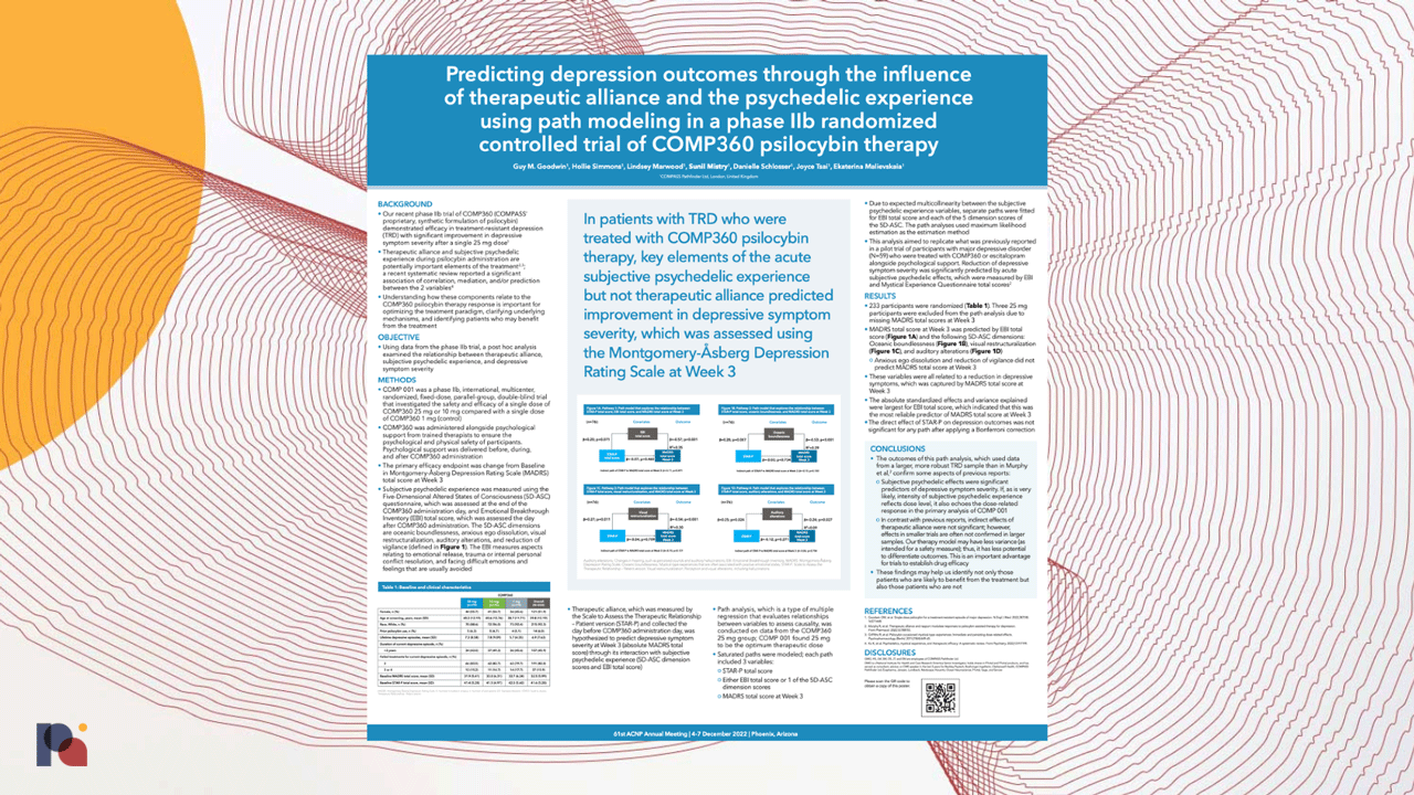 Given this received wisdom regarding the importance of therapeutic alliance in PATs, many were surprised to learn that a post hoc analysis of COMPASS Pathwaysâ Phase 2b trial4 found that therapeutic alliance did not predict improvement in depressive symptom severity.