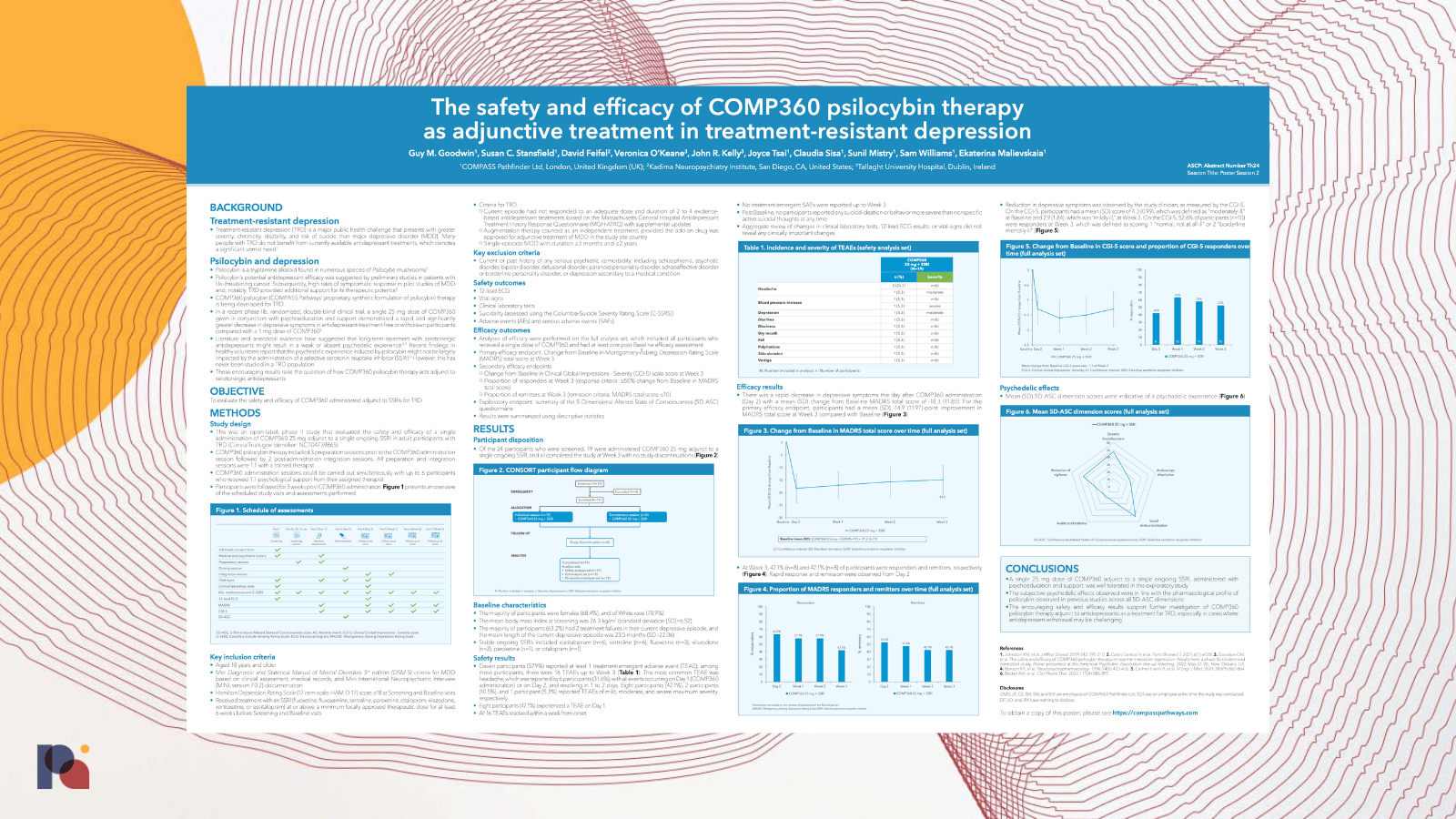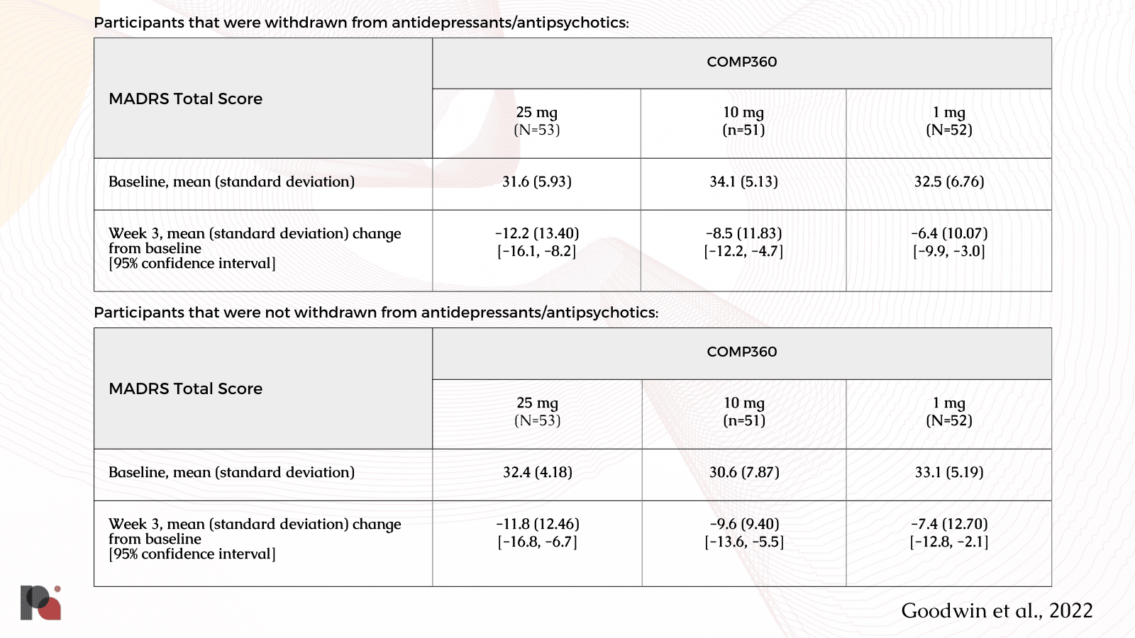 However, these results stand in stark contrast to some released by COMPASS this year. In the Supplementary Appendix of their Phase 2b publication (Goodwin et al, 2022), a post-hoc subgroup analysis12 noted âno apparent difference in the efficacy response of participants withdrawn from antidepressant medication prior to baseline [n=53] compared with those who entered the trial drug-free [n=26].â