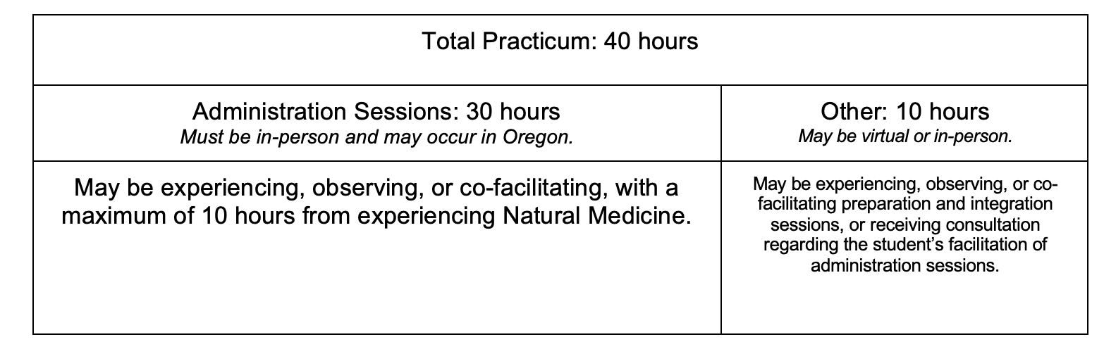 While a previous proposed version of the rules prescribed a rigid distribution of practicum hours, the final version is slightly more flexible. Welcome language changes now make clear that practicum may take place in Oregon. Under the final proposed changes, the 30 hours of required in-person experience in administration sessions may be as a participant, observer, or co-facilitator, with a maximum of 10 hours from experiencing natural medicine.