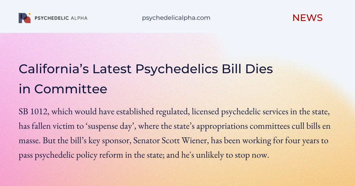 Pα: (We will be covering this more extensively in a forthcoming Bulletin – sign up today.) The Governor’s veto is not entirely surprising, given Newsom’s rumoured national political ambitions. Newsom’s associated letter (which is not something a Governor has to accompany a veto with) doesn’t slam the door closed on psychedelic policy reform, either. But it’s clear Newsom would like to see something more closely focused on ‘therapeutic use’, though the term is admittedly vague. Expect to see Sen. Wiener return next year with a new Bill. Our Editor-at-Large Graham Pechenik and I (Josh Hardman) spoke to Wired about the news. ∎