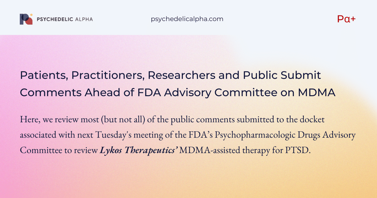 In less than a week, an FDA advisory committee will meet to discuss Lykos Therapeutics’ MDMA-assisted therapy for PTSD (see What to Expect: FDA Advisory Committee Set to Review MDMA-Assisted Therapy for PTSD). Last month, the agency established a docket and issued a request for comments from the public.