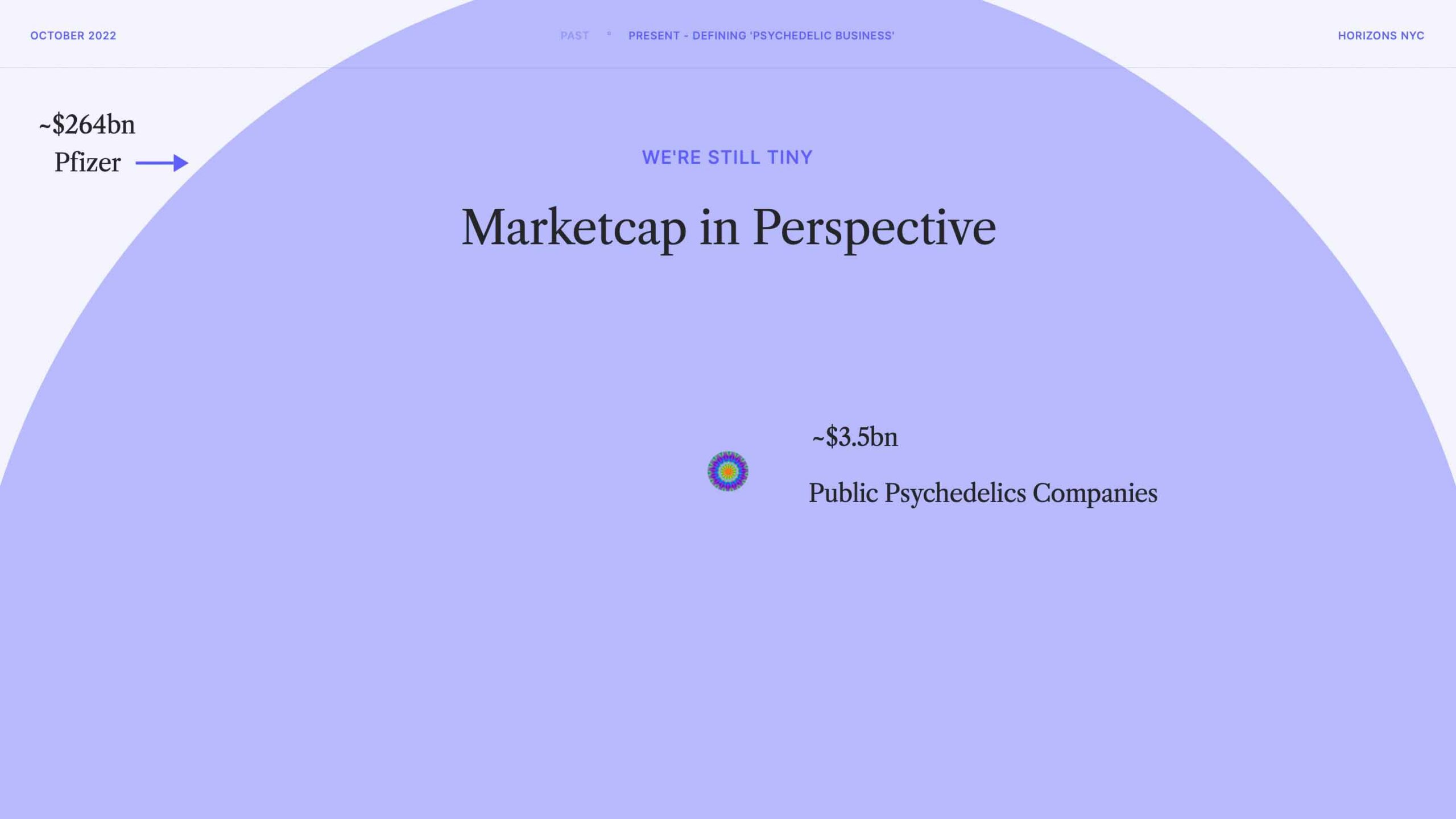 When taken together, the market cap of all public psychedelics companies was around $3.5bn when these slides were originally compiled. Thatâs just over 1% of the market cap of just one âbig pharmaâ company, Pfizer. Itâs early doors.