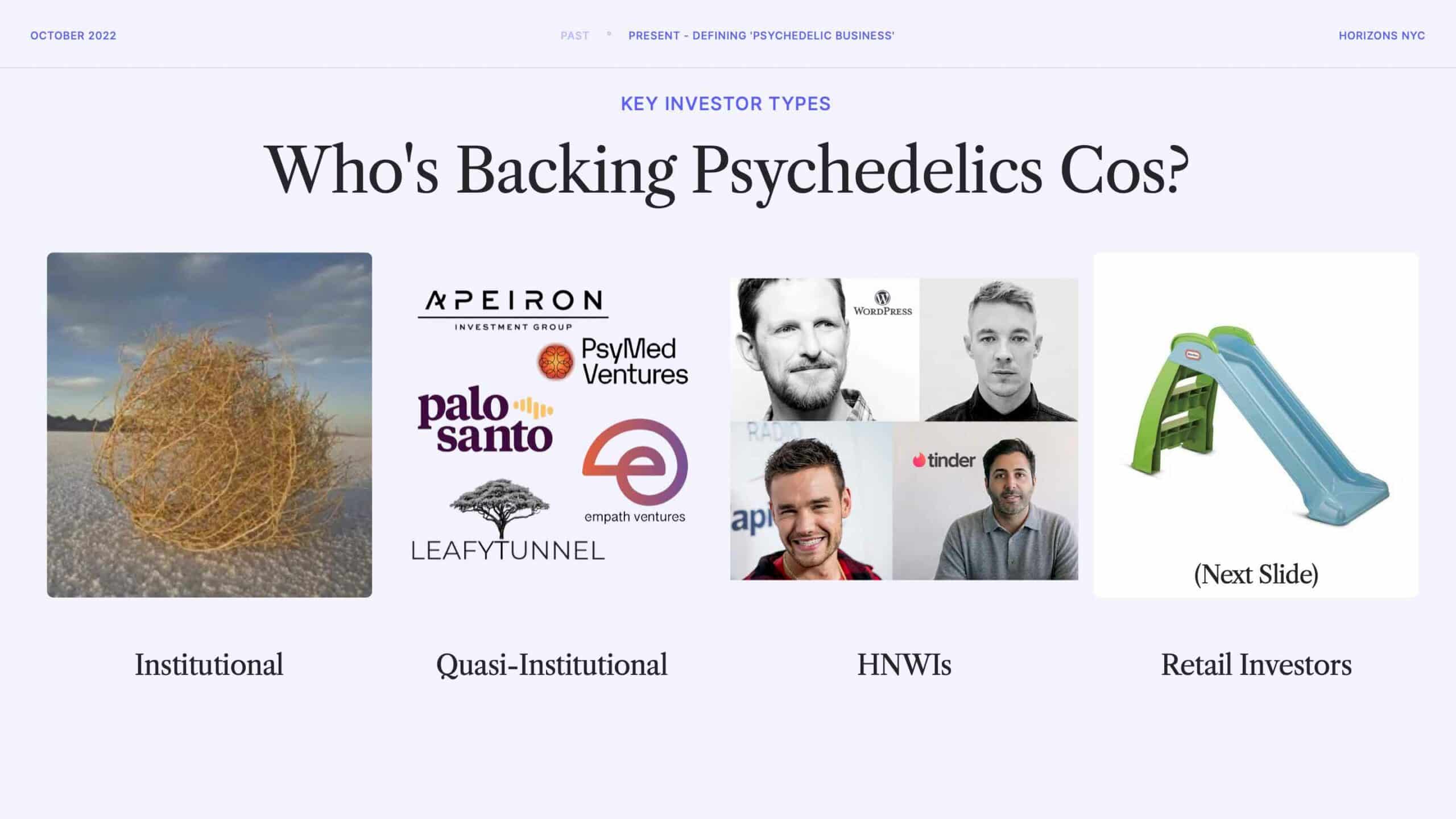 Well, institutional investors are largely absent, except for a few limited cases. Itâs predominantly what I sloppily refer to as quasi-institutional investors: think psychedelic VCs and family offices. These folks are, thus far, driving the majority of investment in early-stage psychedelic companies, at least in the private markets. Theyâre joined by a curious coterie of high net worth individuals which includes the likes of WordPress founder Matt Mullenweg, One Directionâs Liam Payne, and the DJ and music producer Diplo.