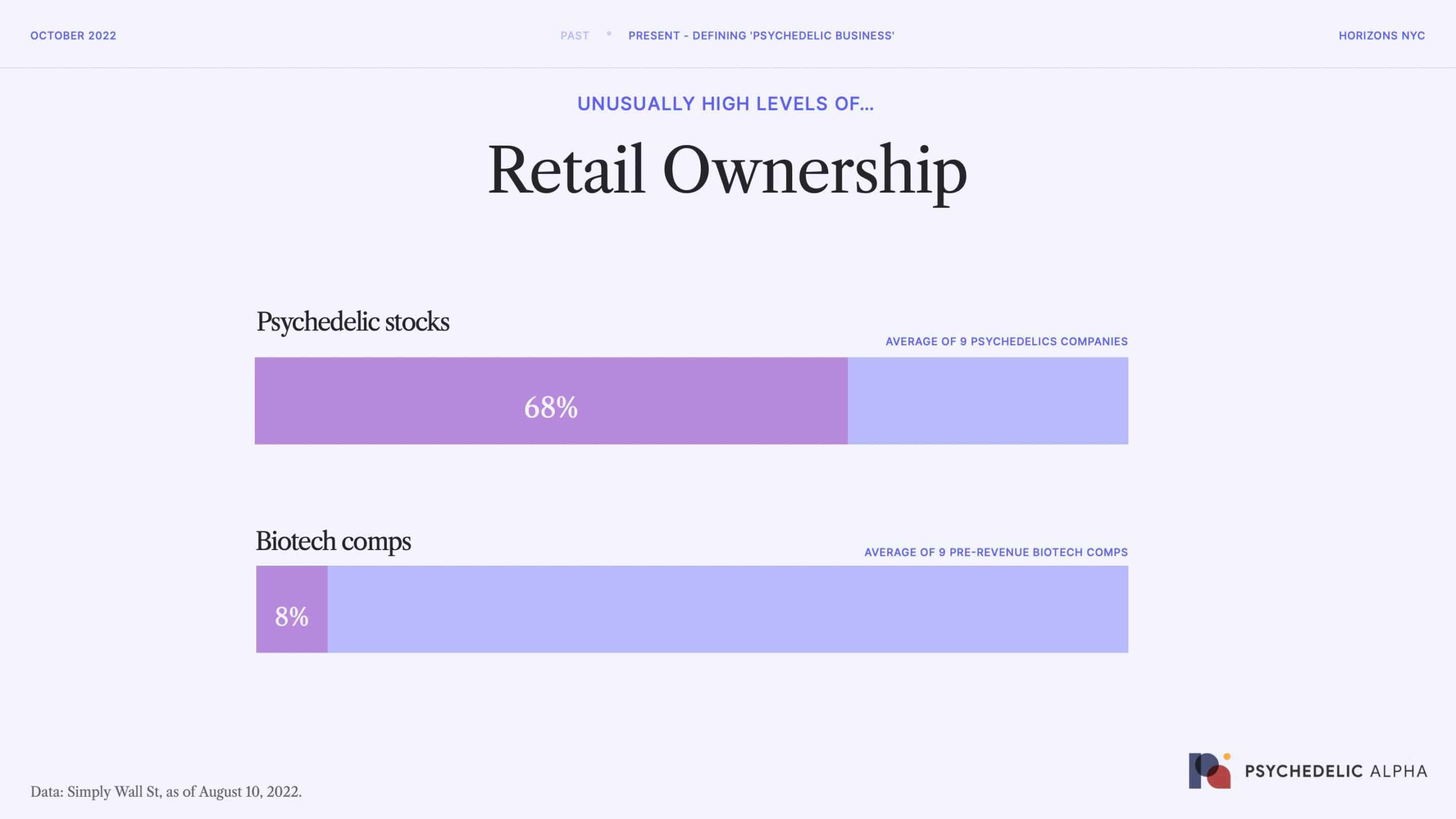We compared the ownership characteristics of 9 representative psychedelics stocks to those of 9 pre-revenue biotech comps, and the results were striking. Psychedelic stocks have an enormous level of retail ownership, which might go some way to explaining the chop we have seen in the markets. It could be argued that many retail investors arenât in for the long haul, which is important when investing in risky assets like biotech.