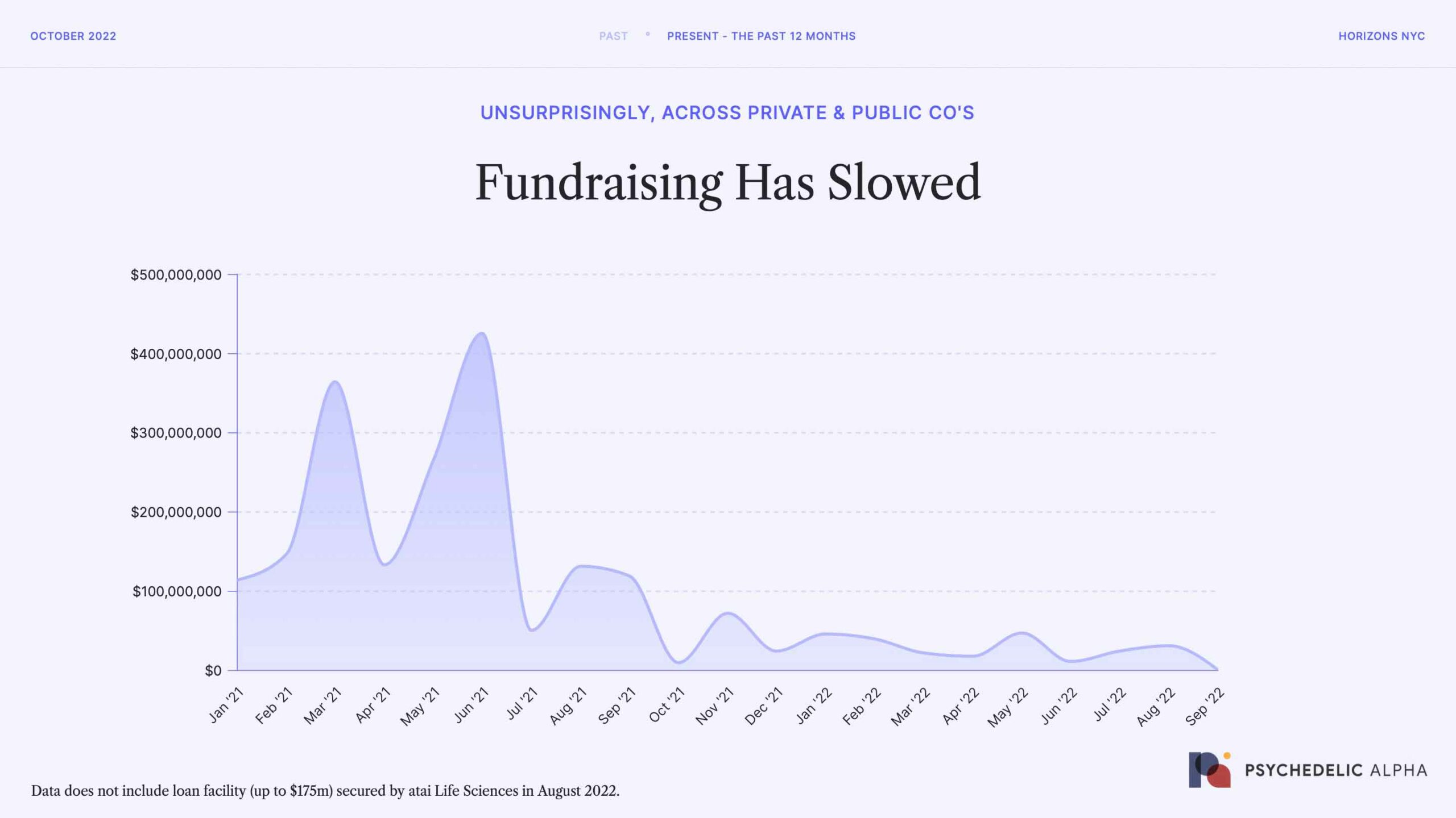 Source: Psychedelic Alpha data, which captures both public and private fundraising. Do note that this graph excludes a loan facility secured by atai Life Sciences in August 2022.