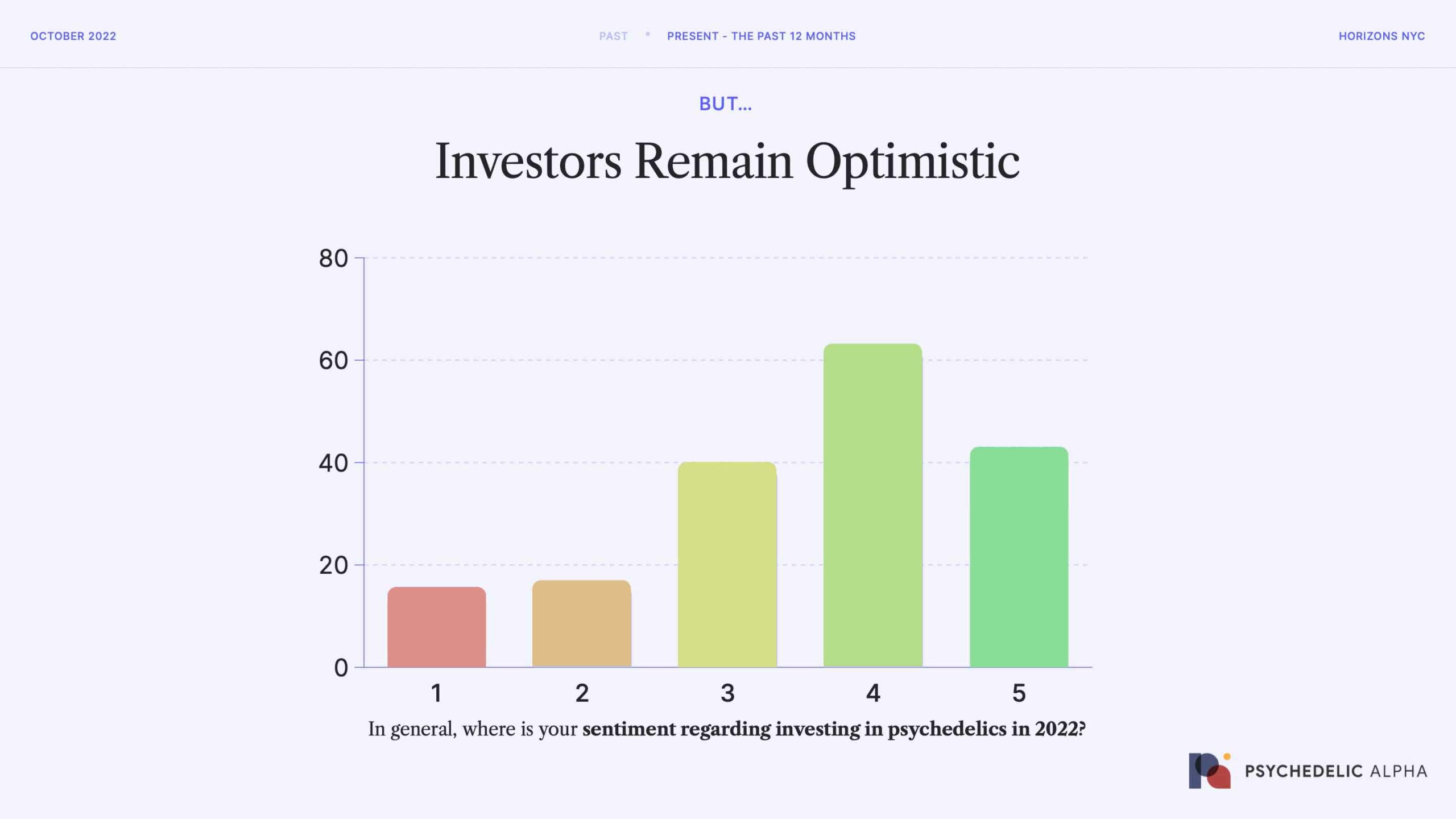According to our Summer 2022 Psychedelic Investor Pulse Survey, the majority of psychedelic investors in our community remain largely positive. What was most striking from this survey is that the larger, quasi-institutional investors were the most optimistic, and demonstrated the most staying power.