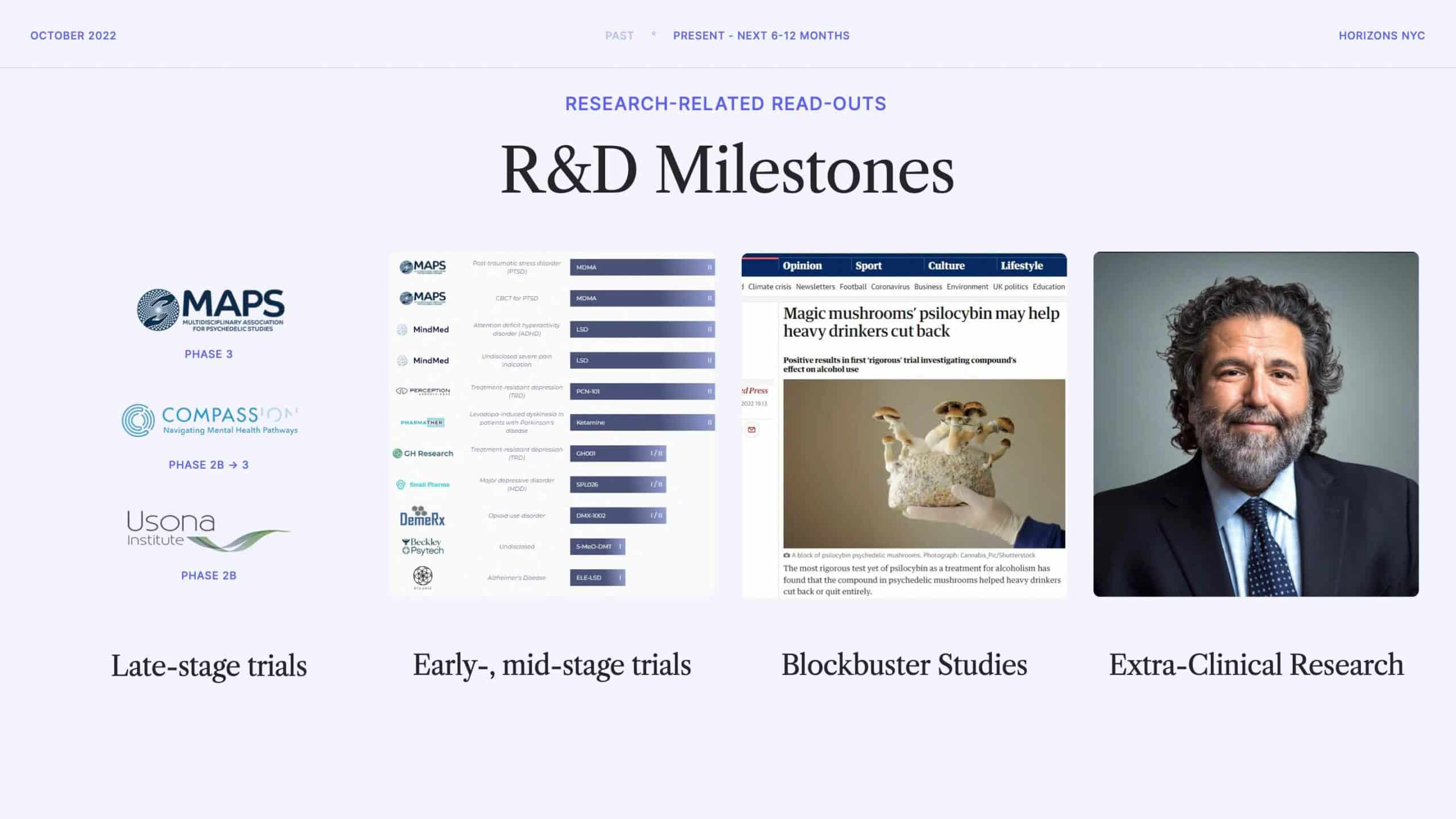 On the drug development side there are a variety of milestones on the horizon. MAPS is in its second Phase 3 trial of MDMA-assisted therapy for PTSD and COMPASS Pathways is hoping to commence the first Phase 3 trial of psilocybin by the end of this calendar year, to name just a couple of examples.