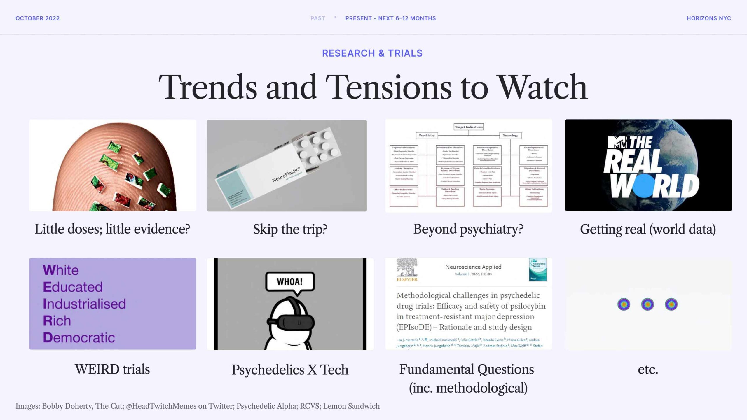 I only had time to touch on a couple of these during my presentation. First was the trend toward exploring the potential of non-hallucinogenic psychedelics (or, âpsychoplastogens), which has become an increasingly popular avenue of investigation and investment. I expect this to only continue in the next 6-12 months as these molecules enter the first in-human trials, and the innovative trial methodologies of groups like those at Stanford (Boris Heifetsâ) and University of Wisconsin share their findings.