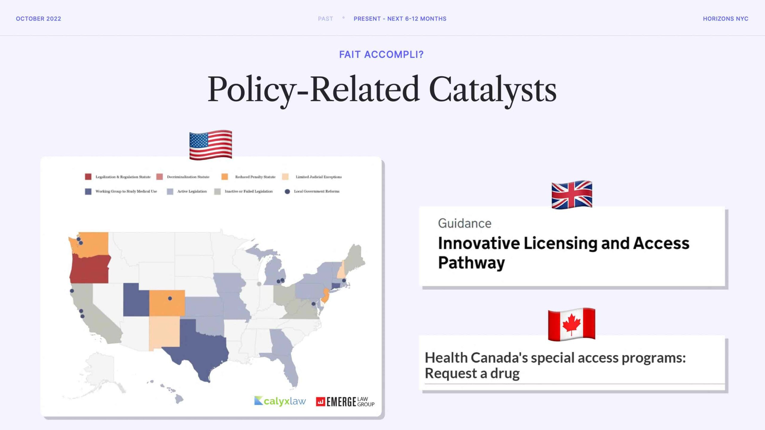 Beyond R&D, we should also expect to see further policy catalysts in the next 6-12 months. As you can see from our Psychedelic Legalization and Decriminalization Tracker, thereâs a great deal of activity across the U.S. Thereâs also the Oregon Psilocybin Services Tracker, which keeps tabs on counties and cities that are sending opt-out initiatives to voters this November.