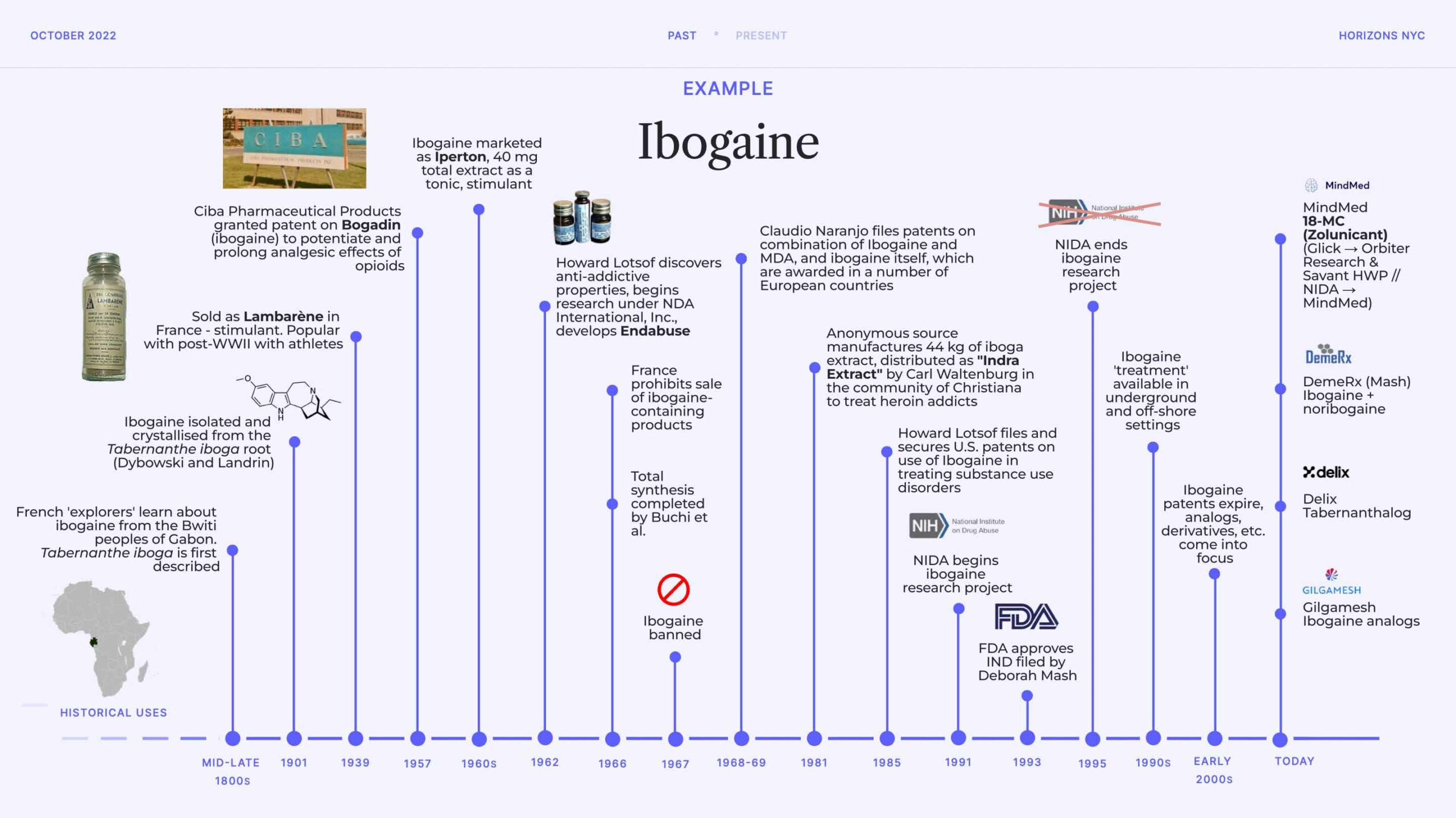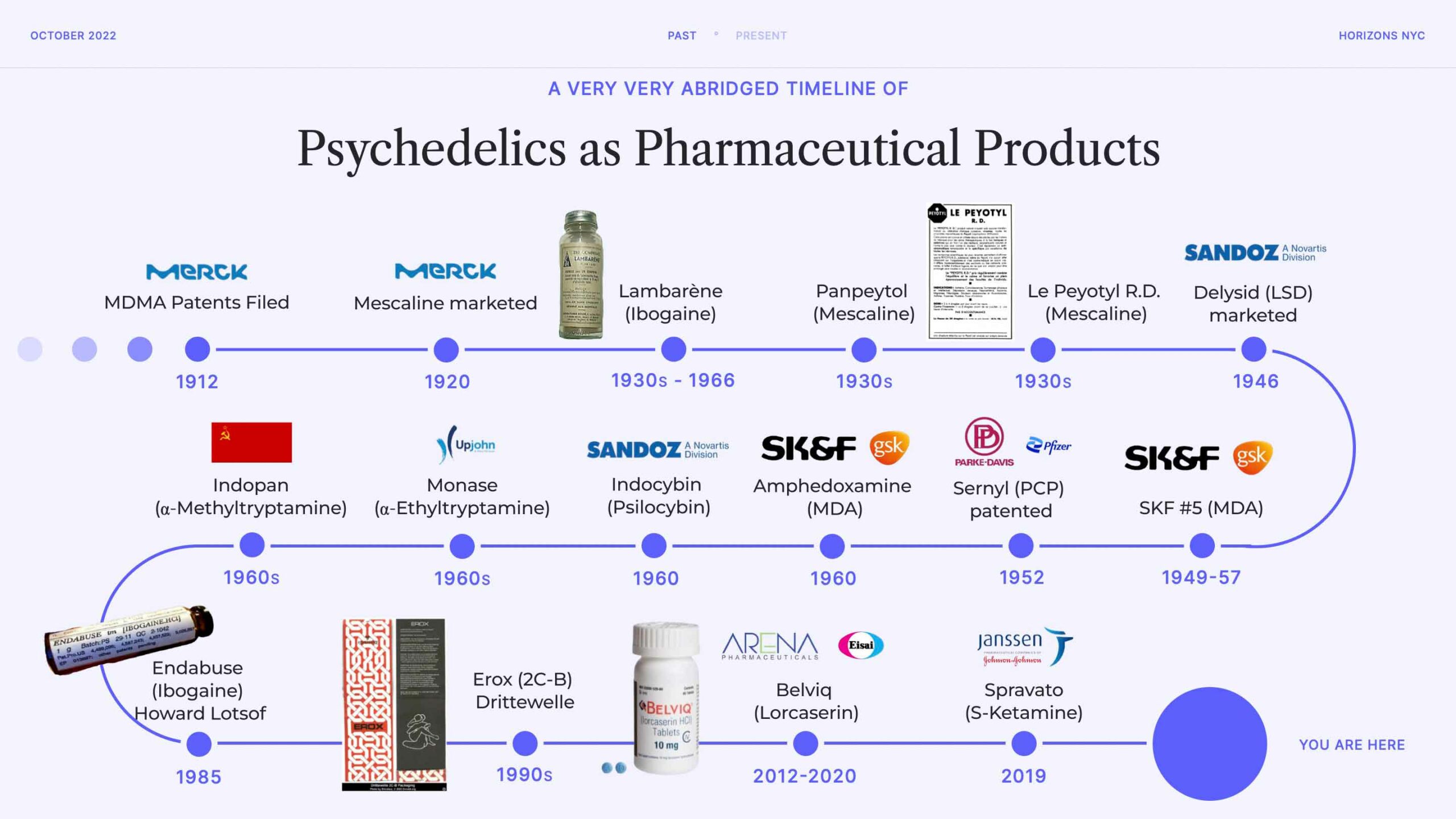 I decided to ground my presentation on âpsychedelic businessâ with a little historical context. So, the first couple of slides provide some abridged timelines of psychedelics as pharmaceutical products, and the third looks at mid-century psychedelic-assisted therapy offerings.
