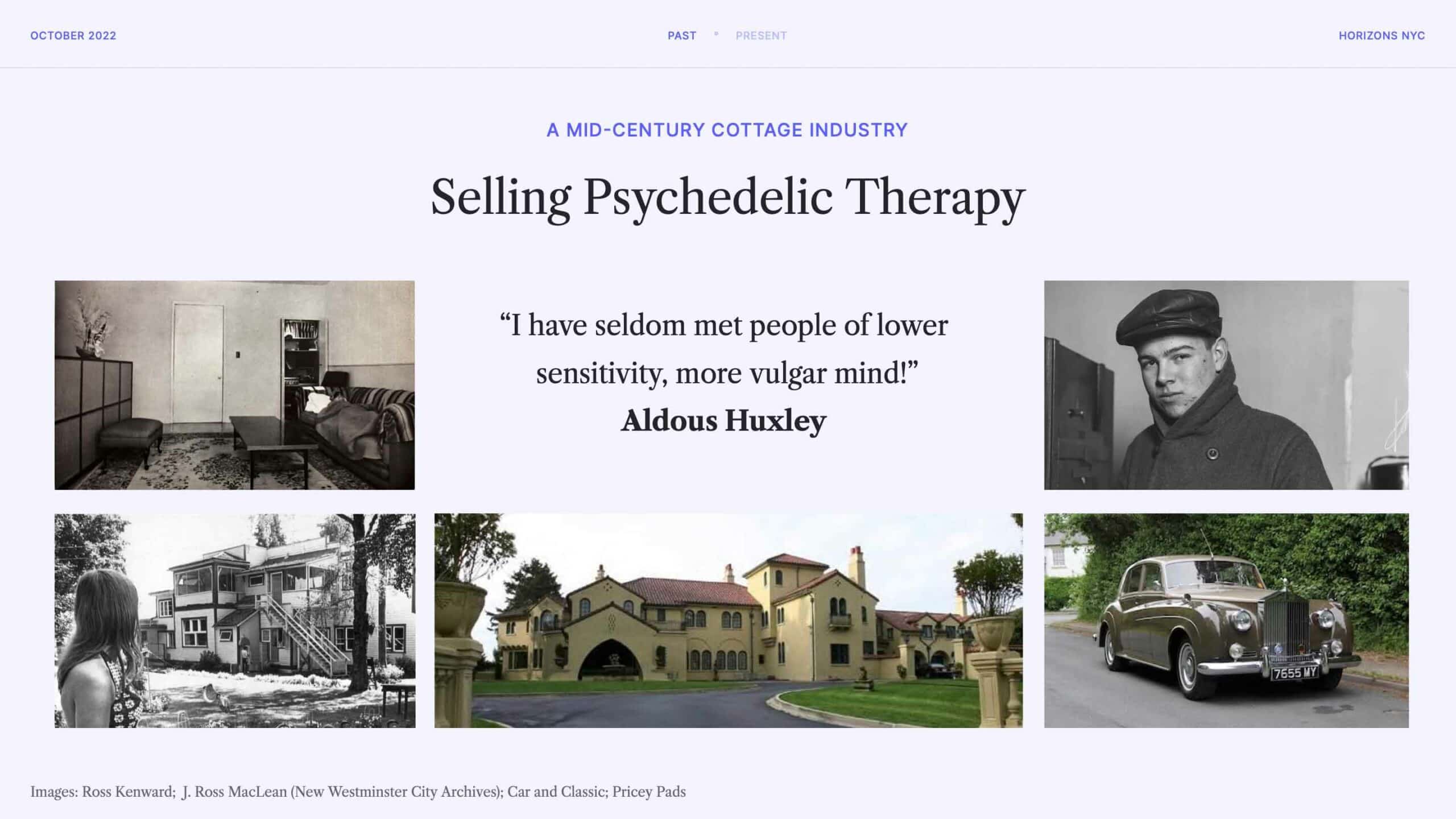 This slide shows images of The Hollywood Hospital (Vancouver, not LA) which was founded by J. Ross MacLean and Al Hubbard. They would charge patients up to $1,000 for LSD therapy, which is around $10,000 in todayâs money, and remember that these types of set-ups were often getting the LSD from Sandoz for free (or thereabout). Clients of these types of services included the likes of Cary Grant and Betsy Drake. See Montecristo Magazineâs history for more.Â