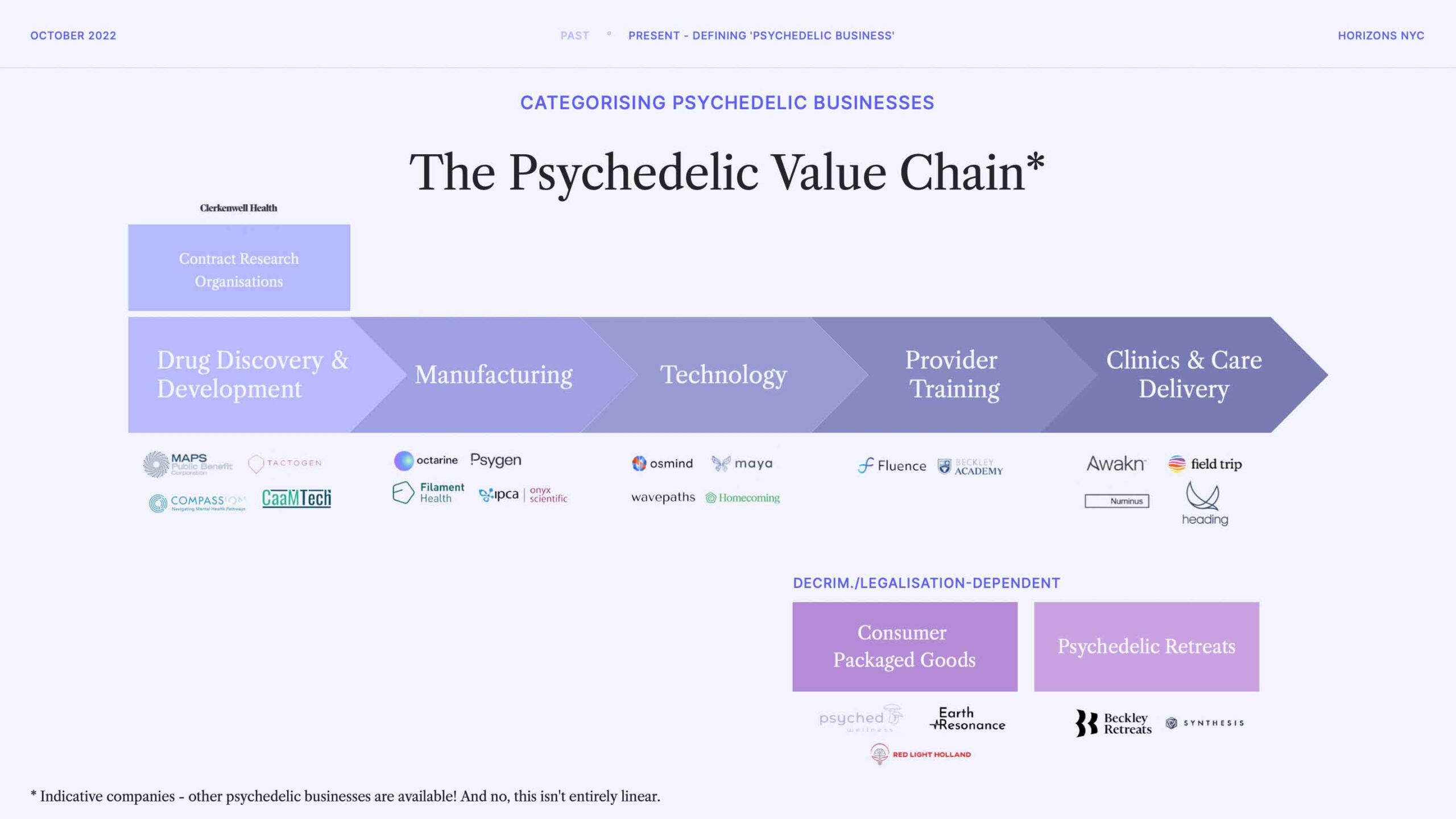 So, first things first: what do psychedelics companies actually do? The easiest way to show this is by visualising companies along a value chain. There are many ways of splicing these segments, but we found this to be the most useful.