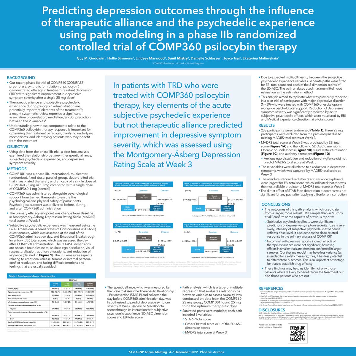 The poster in question was titled Predicting depression outcomes through the influence of therapeutic alliance and the psychedelic experience using path modeling in a phase IIb randomized controlled trial of COMP360 psilocybin therapy.