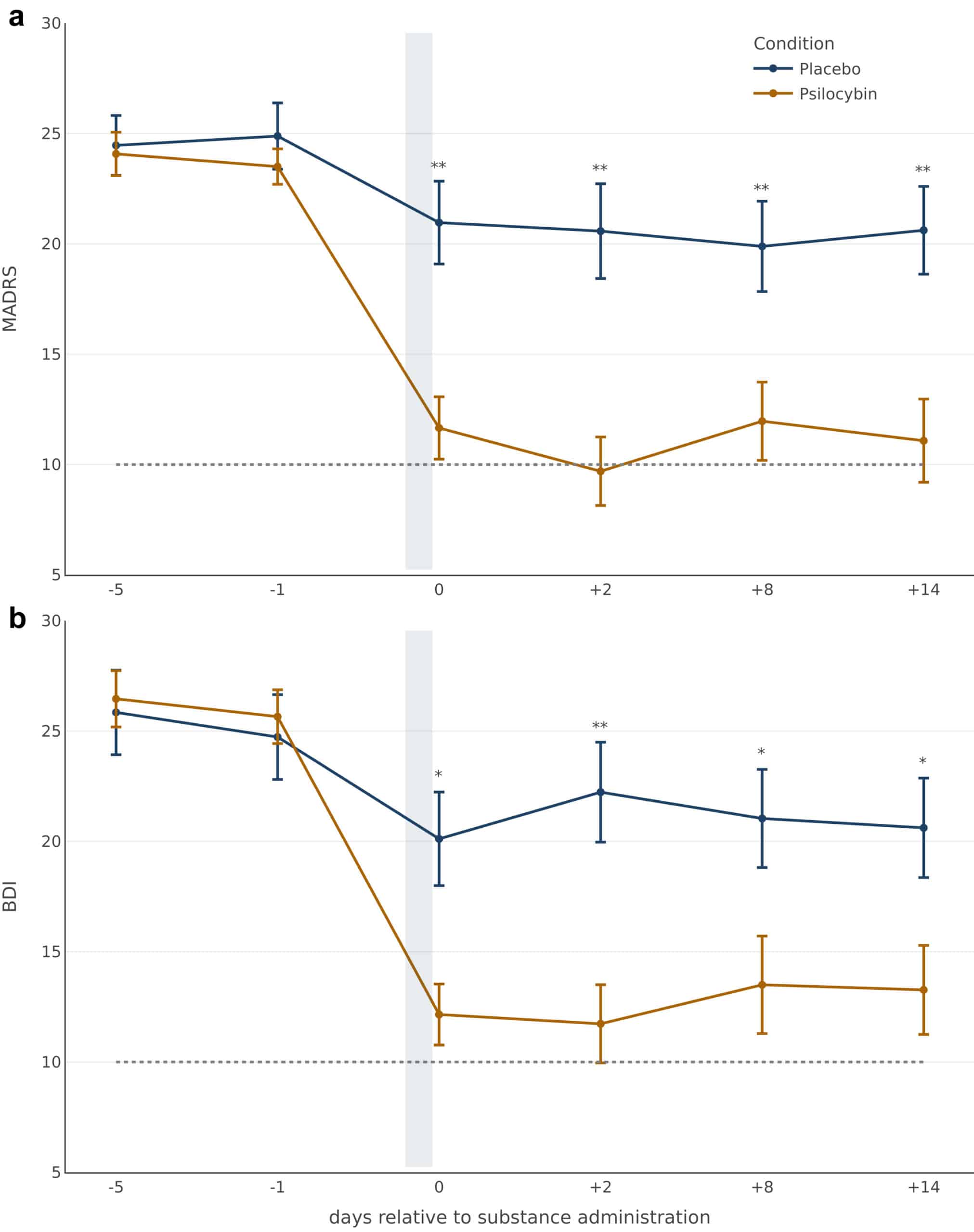 Psilocybin (n=26) produced short-term antidepressant effects (up to 2 weeks) with a 13-point decrease on the MADRS10 compared to baseline, which was significantly different from the placebo group (n=26). As the first modern placebo-controlled trial of psilocybin11, it provides some assurances that the symptomatic improvements in depression cannot be solely attributed to the non-pharmacologic effects of the supportive therapy. Contrary to a purported therapeutic mechanism, the overall intensity of psilocybinâs subjective effects was not strongly associated with its antidepressant effects12. The comparatively lower dose of psilocybin and reduced psychological support was well-tolerated with no serious adverse events.